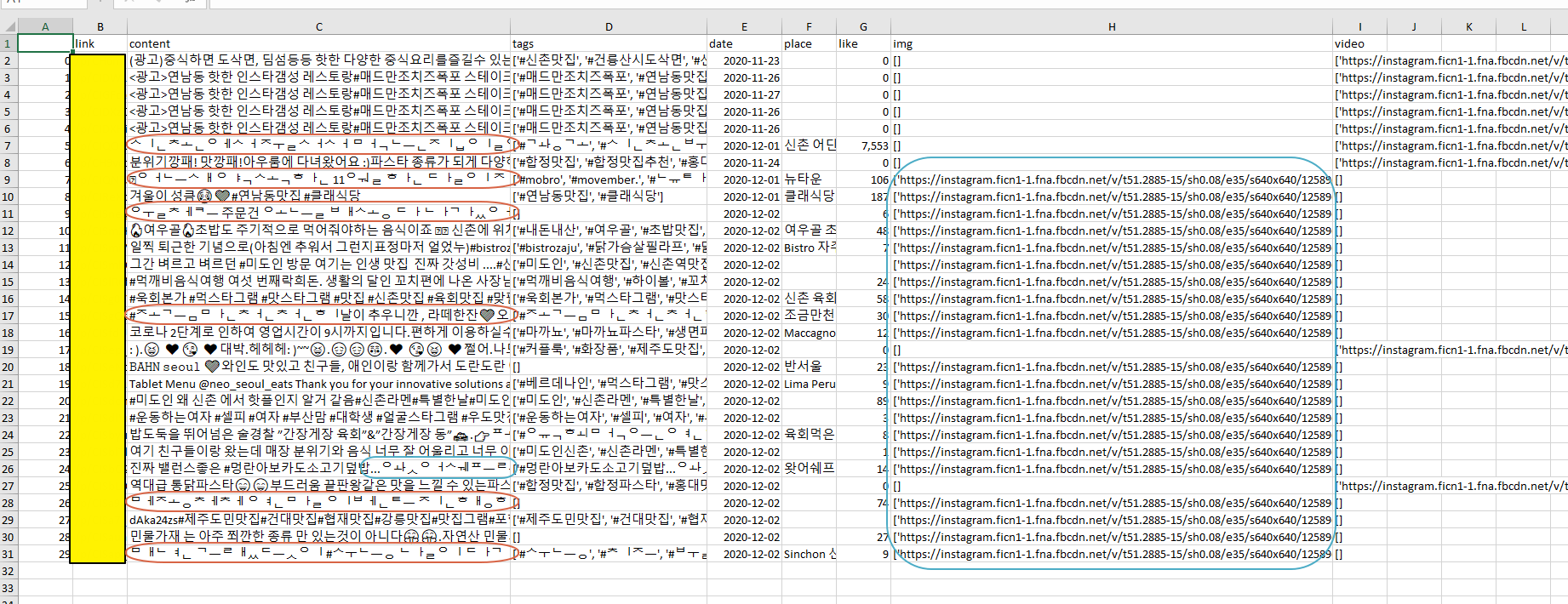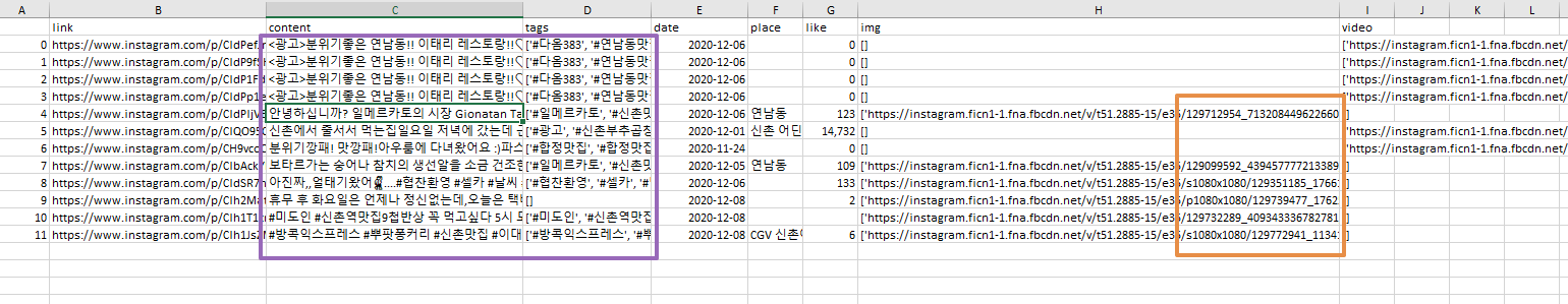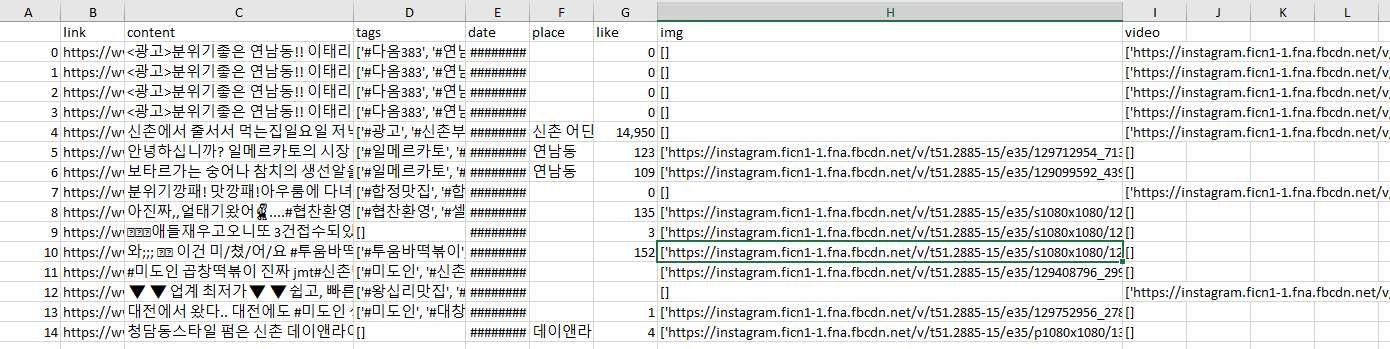 Part 1. 인스타그램 링크, 본문, 해시태그, 작성일, 이미지, 영상, 좋아요 개수, 장소 크롤링