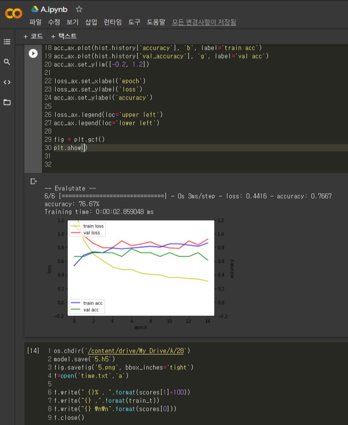 해당 데이터는 층수가 증가하면 정확도가 떨어졌고, 풀링층 또한 추가하지 않았을 때 더 좋은 성능을 보였다. 다만 정확도만을 고려했을 때 79.552%의 정확도를 보인 모델이 있는데 이는 바로 현재 모델에 dense 512, dense 256을 추가한 모델이다. 하지만 이 모델의 경우 기존 학습시간이 2.1072 인데 반해 학습시간이 24.163 초로 약 10배 이상의 학습시간이 소요되며 소요시간에 비해 정확도 차이가 유의미하지 않다고 판단, 최적화 모델로 선택하지 않았다.