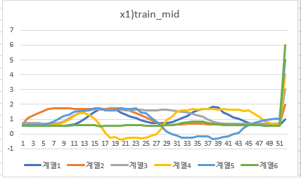 주어진 데이터 셋은 각 위치당 x, y, z의 데이터가 주어졌고 train과 test셋이 나누어진 채로 제시되었다. 각 행동은 시계열 데이터로 기록되었고 한 채널당 51개의 데이터 열과 52번째 열의 라벨링으로 행동을 구분하였다. 해당 실험에서 분류하고자 하는 6가지 행동은 ‘I have command’, ‘All clear’, ‘Not clear’, ‘Spread wings’, ‘Fold wings’, ‘Lock wings’이다. 6가지 수신호의 양상을 살펴본 결과 왼쪽 손, 팔은 가만히 있는 행동이 3가지 이므로 오른쪽 손목과 엄지의 움직임 데이터를 바탕으로 모델을 구성하였다. 또한 데이터 자체적으로 train, test셋이 나누어져 있어 이를 바탕으로 실험을 진행하였고 추가적으로 validation set을 구성해 모델의 성능을 평가하고 학습하는데 이용하였다.