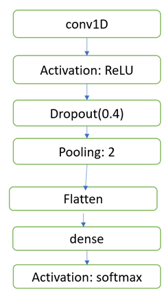 이 모델은 78.67%의 정확도와 2.62초의 학습시간을 보여주었다. 2개의 층으로 구성하였고 첫번째 층과 두번째 층 모두 필터 사이즈 32, 커널사이즈 12, activation ReLU함수를, dense 6, 풀링층은 첫 번째 층에만 추가하였다.