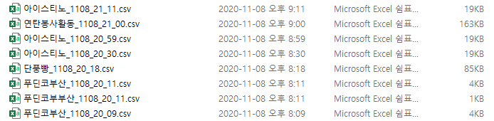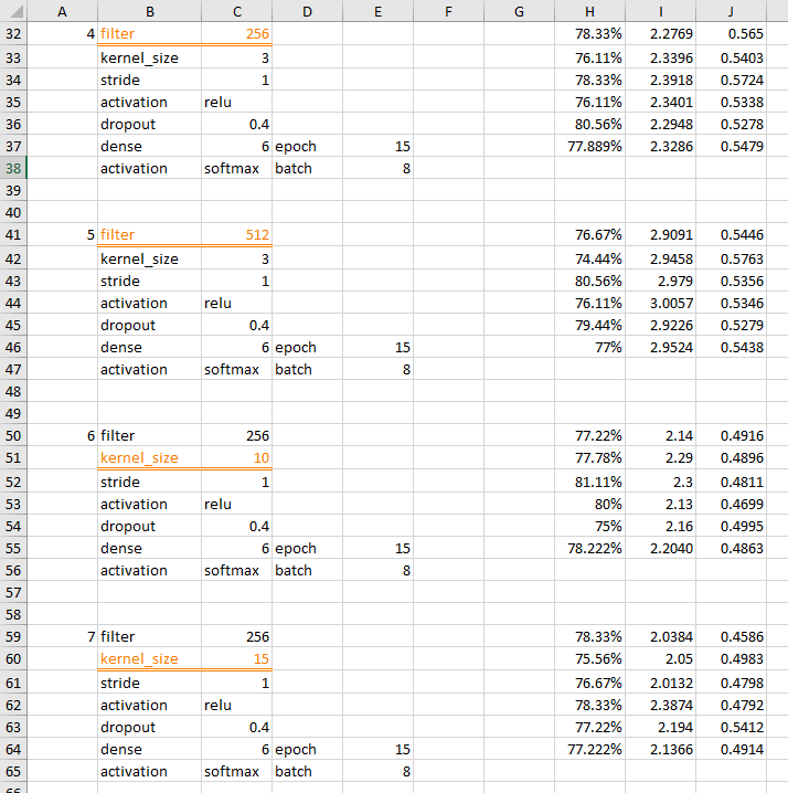 대략 80 번의 실험을 시행하였는데 이를 엑셀 파일로 정리한 결과는 다음과 같다.