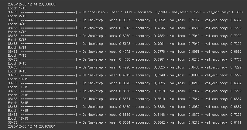 hist=model.fit(X_train_r, y_train,validation_data=(X_valid_r,y_valid), epochs=15, batch_size=5)