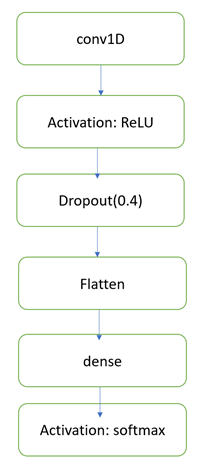 이 때 사용한 필터는 256, 커널 사이즈 8, relu함수를 이용하였고 class의 개수인 6을 dense층으로 사용, epoch 15와 batch사이즈 5의 모델을 이용하였다.