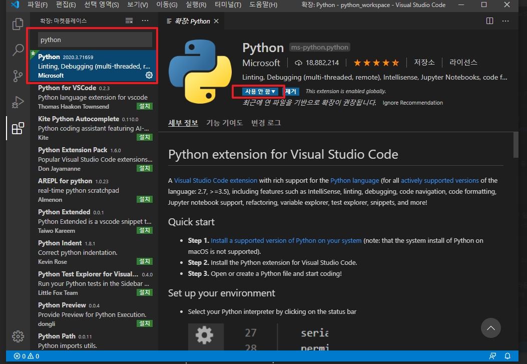 저 아이를 설치해 주면 끝인데 설치는 지금 사용안함 이라고 되어있는 저 버튼이 원래는 Install 또는 설치 로 되어있다.