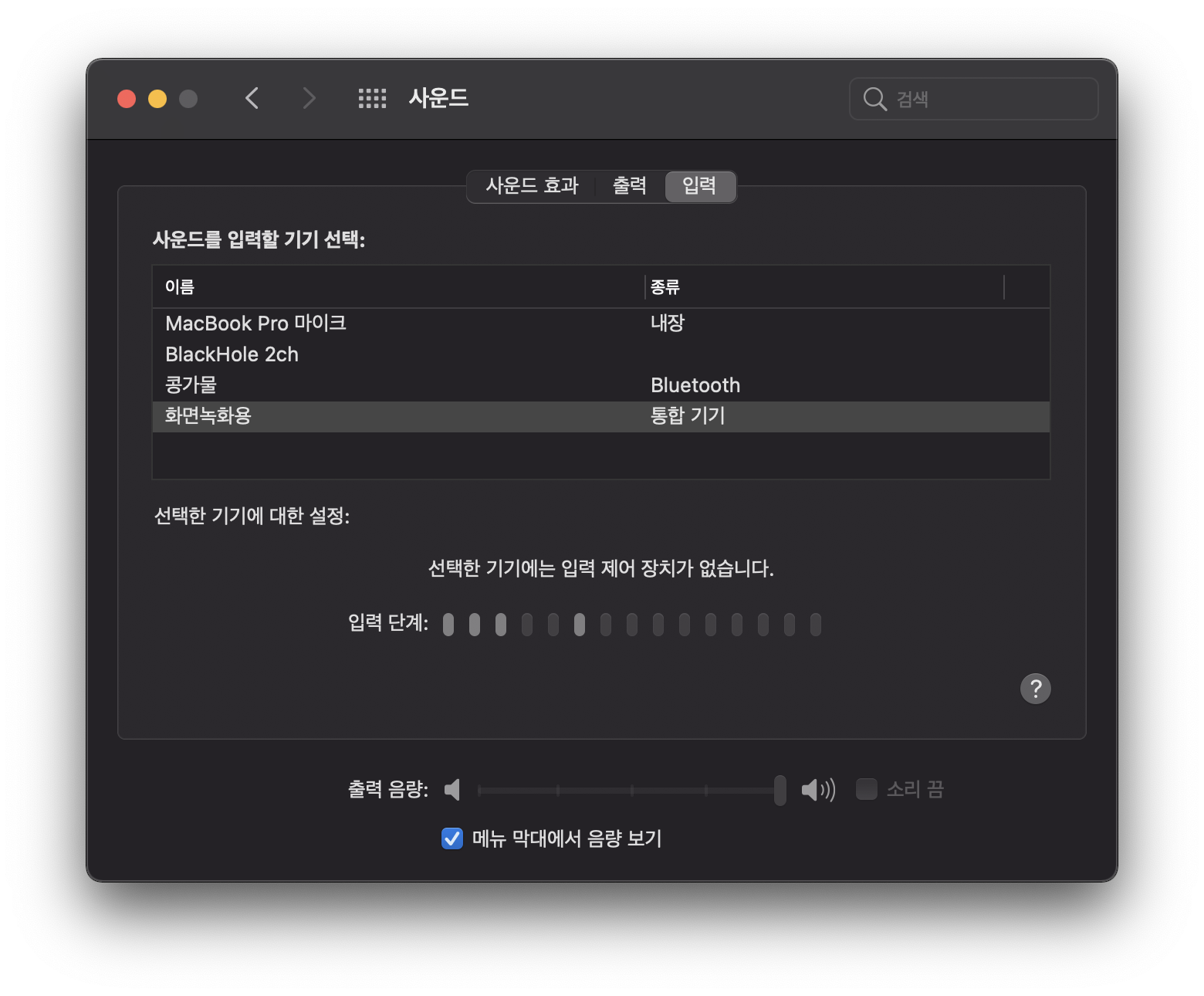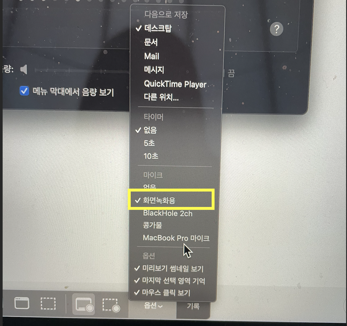 옵션을 누르고 화면녹화용 을 선택하면 소리가 포함되어서 녹화된다.