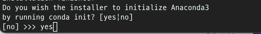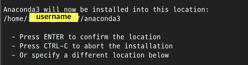 경로는 기본적으로 /home/[username]/anaconda3 이며 별도로 수정하지 않는다면 ENTER를 입력